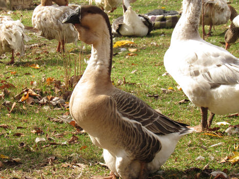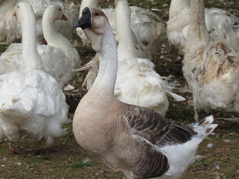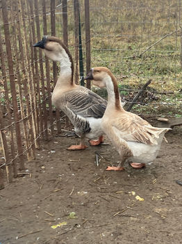We currently have a flock of around 10 dewlap africans from 3 different breeders across the US. We offer brown and buffs. This breed is distinguishable by their large knob and dewlap as well as their loud "honk". They are the most skittish breed we own but that doesn't stop over half of them from acting like puppies. This large breed can easily eat their weight in food and likes to be the boss of the yard